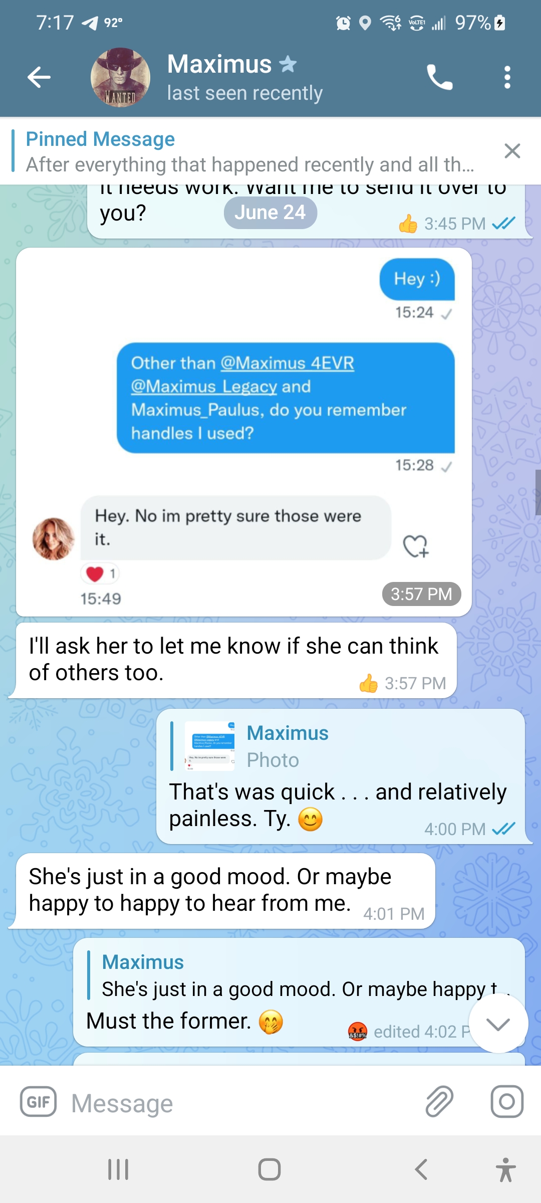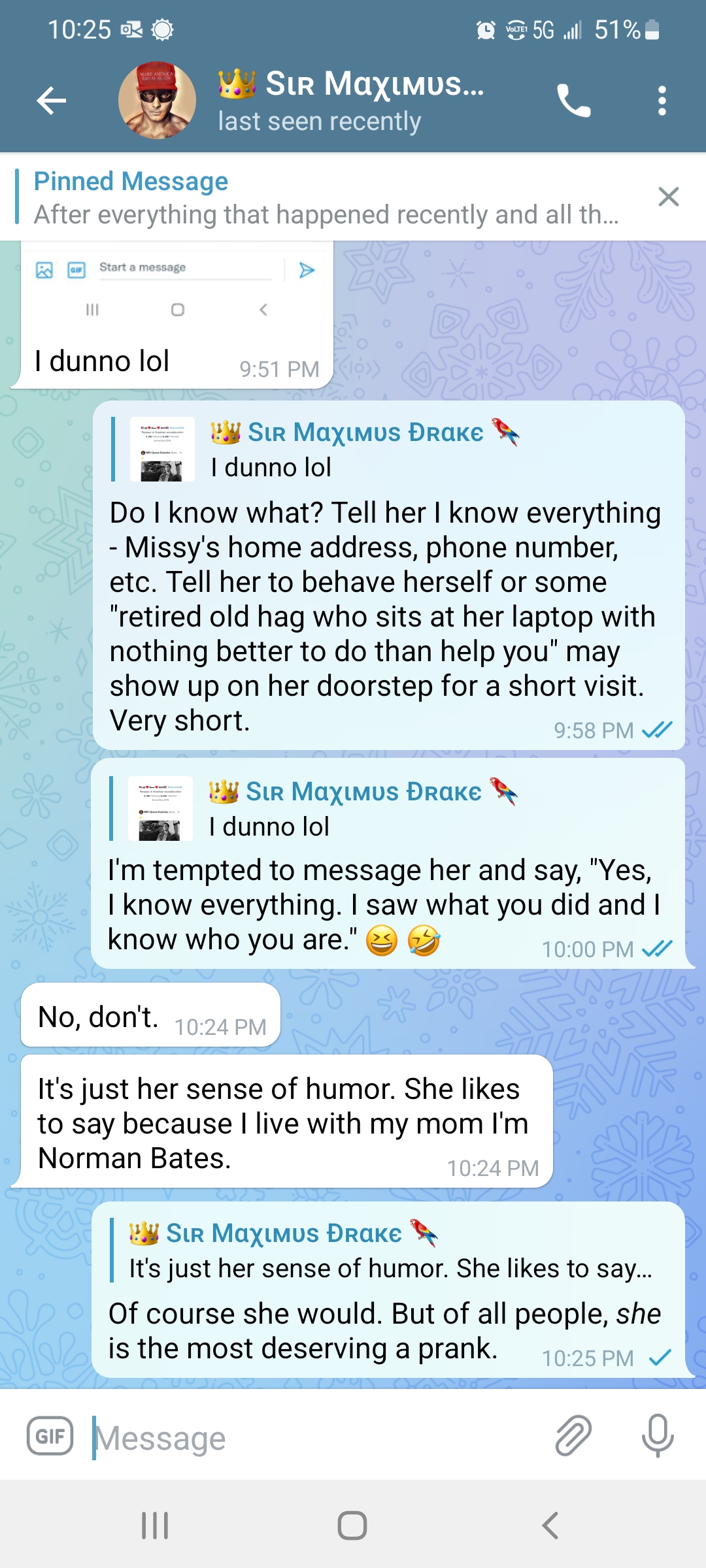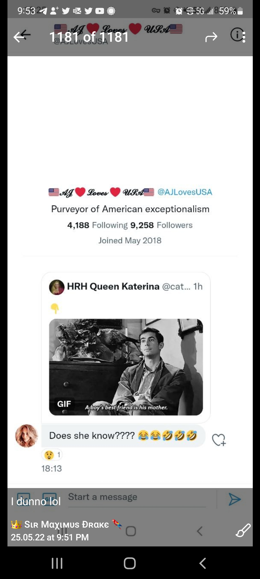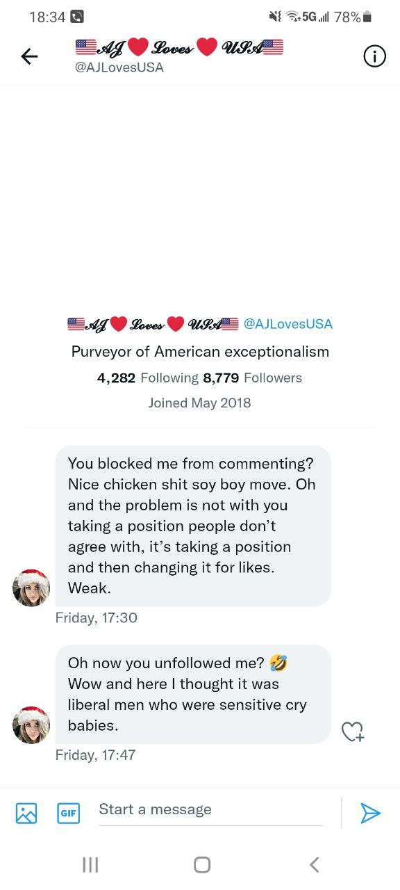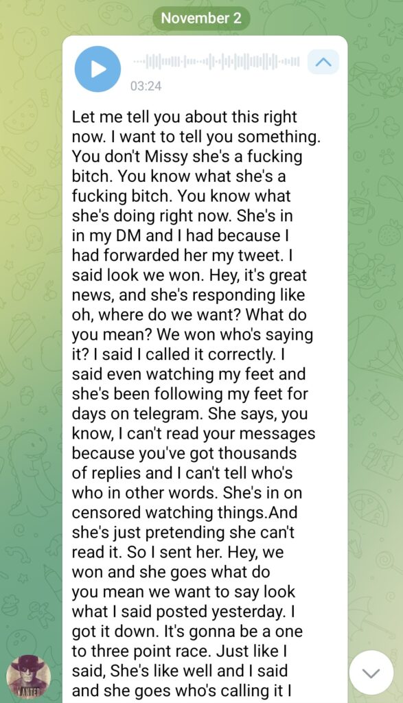 Let me tell you about this right now. I want to tell you something. You don’t Missy she’s a fucking bitch. You know what she’s a fucking bitch. You know what she’s doing right now. She’s in in my DM and I had because I had forwarded her my tweet. I said look we won. Hey, it’s great news, and she’s responding like oh, where do we want? What do you mean? We won who’s saying it? I said I called it correctly. I said even watching my feet and she’s been following my feet for days on telegram. She says, you know, I can’t read your messages because you’ve got thousands of replies and I can’t tell who’s who in other words. She’s in on censored watching things.And she’s just pretending she can’t read it. So I sent her. Hey, we won and she goes what do you mean we want to say look what I said posted yesterday. I got it down. It’s gonna be a one to three point race. Just like I said, She’s like well and I said and she goes who’s calling it I said well decision desk and I need a heavy hitter than that. I said the decision desk I said, how about Nate cone at the New York Times? How about David Wasserman from National Journal? I said, I mean would they do she goes I need to I need somebody heavier. I said who Fox to call it. I said, well, you know, it’s a blah and I’m sitting there and I’m going down you realize that I have called this race. I mean, you know we’ve won and I don’t know why you’re playing the California liberal right now. You know, I don’t understand that why you’re being so you’re good, you know fraud in this now I’m saying oh bullshit on that. I said toodles I said, I’ve got to move on I got bigger things to fry. I gotta start thinking about 2022 you can sit there and rot, but I went just a fucking bitch that woman as I can’t stand her guts and she just comes out of the woodwork just to throw cold water on it and the thing is the iron irony in all this is she starts bringing this up days ago to me about how she can’t read my telegram Channel and then I’m going back. Hey look we want here’s and see the see the feed can’t you read the feed and I mentioned I was mentioning to her previously my feet and she won’t even then say good job, or that’s great. Nothing. She pulls this bullshit out right now ever since um, our big argument our second or third big. Well, we’ve had several but ever since our big like complete separation conversation friendship in late last November right around Thanksgiving when she was really active. Everything I was saying on Twitter analyzing The Fallout and and whatnot ever since then. She’s been on this. Let me throw cold water on whatever you’re doing kind of shit stick of hers and with the brief exception of her reaching out six seven eight nine months ago just to see what I was doing because I was too quiet for six months and she was noticing I was getting to be she just Reus her head to stick her bullshit in my in in my face and I can’t stand her guts. I really she really thinks she’s something special and what is she doing now? She’s going she goes I’m out in the real world, but real friends having drinks. What the fuck? Is that supposed to mean? What the fuck? Is that supposed to mean we’re winning elections. Do you see the people I’m talking to online does you see? Well, that’s not reality. You know, what’s reality sitting there? What a fucking cocktail in your mouth and your hand. Getting drunk and enjoying every bit of your 50 years of age and you look at when you don’t have your filters on your phone your on your pictures. A fucking what a fucking joke, that is can’t stand that woman. Anyways, I’m done venting. I’m gonna go have dinner and watch Dallas. Ciao.